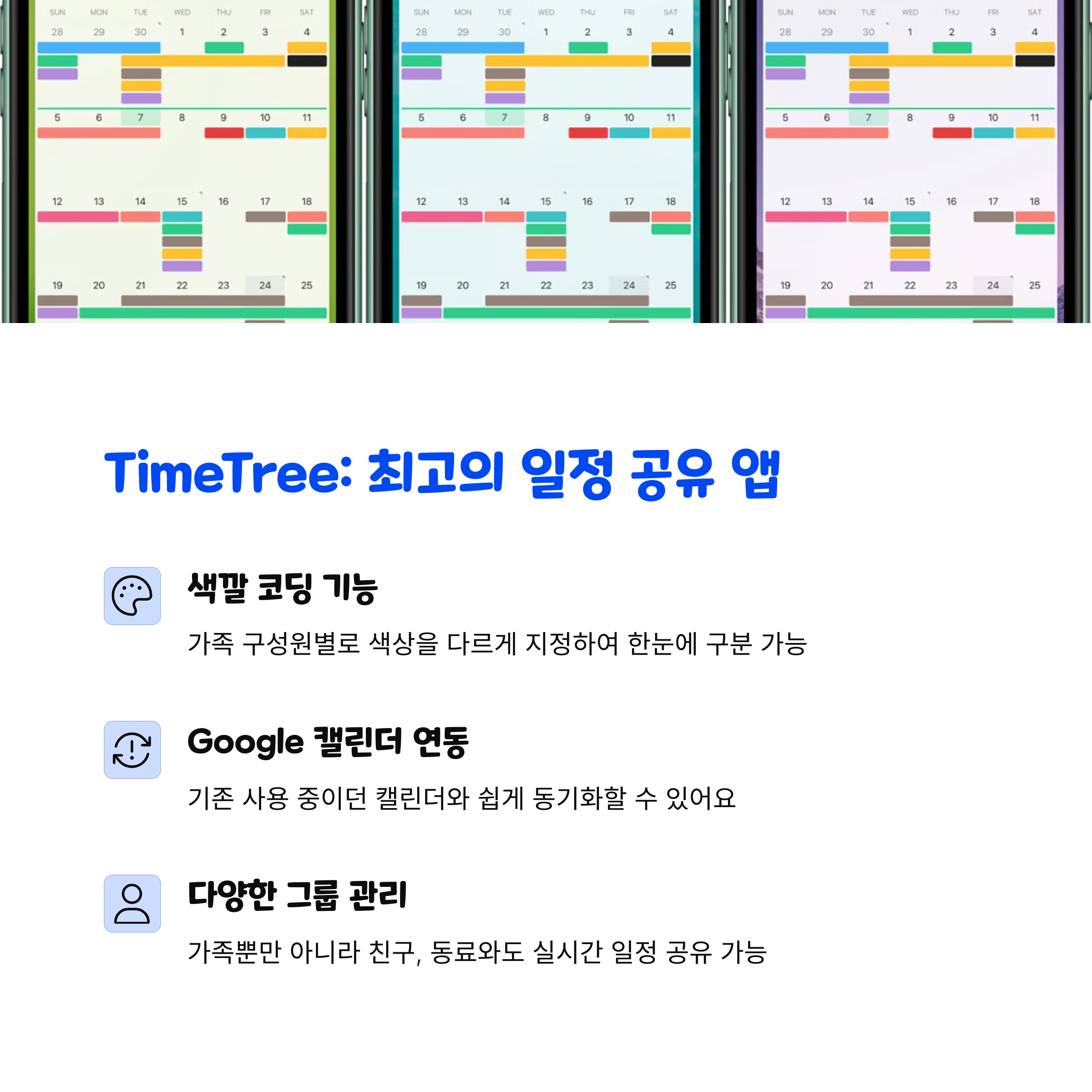 TimeTree | 일정 공유, 댓글, 알림 | 가족 단위 캘린더, 디자인 깔끔 |